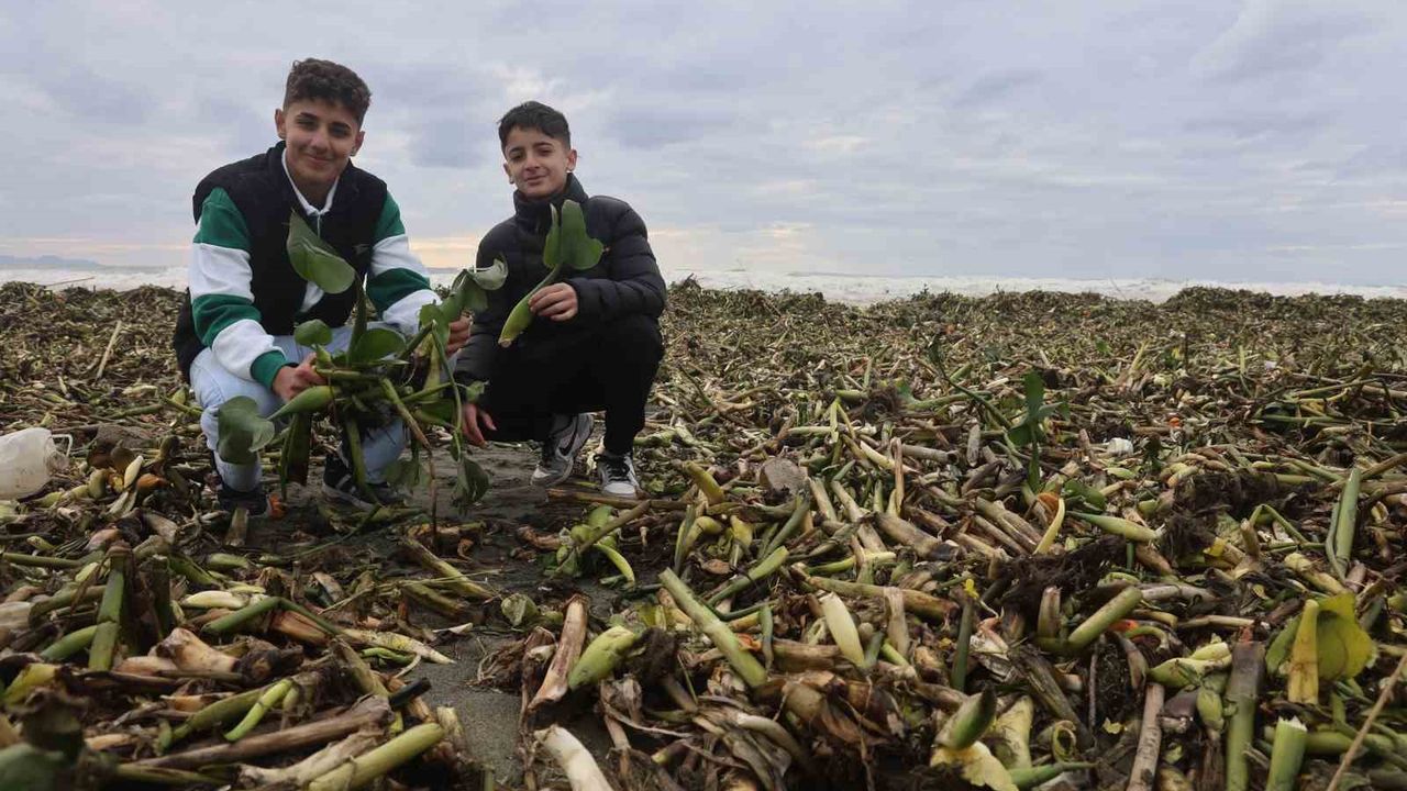 Hatay'da yaz aylarında Asi Nehrin kaplayan istilacı su sümbülleri, kentte etkili olan şiddetli fırtına ve yağışla birlikte Akdeniz'e döküldü. Denizdeki dalgaların kıyıya vurduğu su sümbülleri, Samandağ sahilini yeşile büründü.