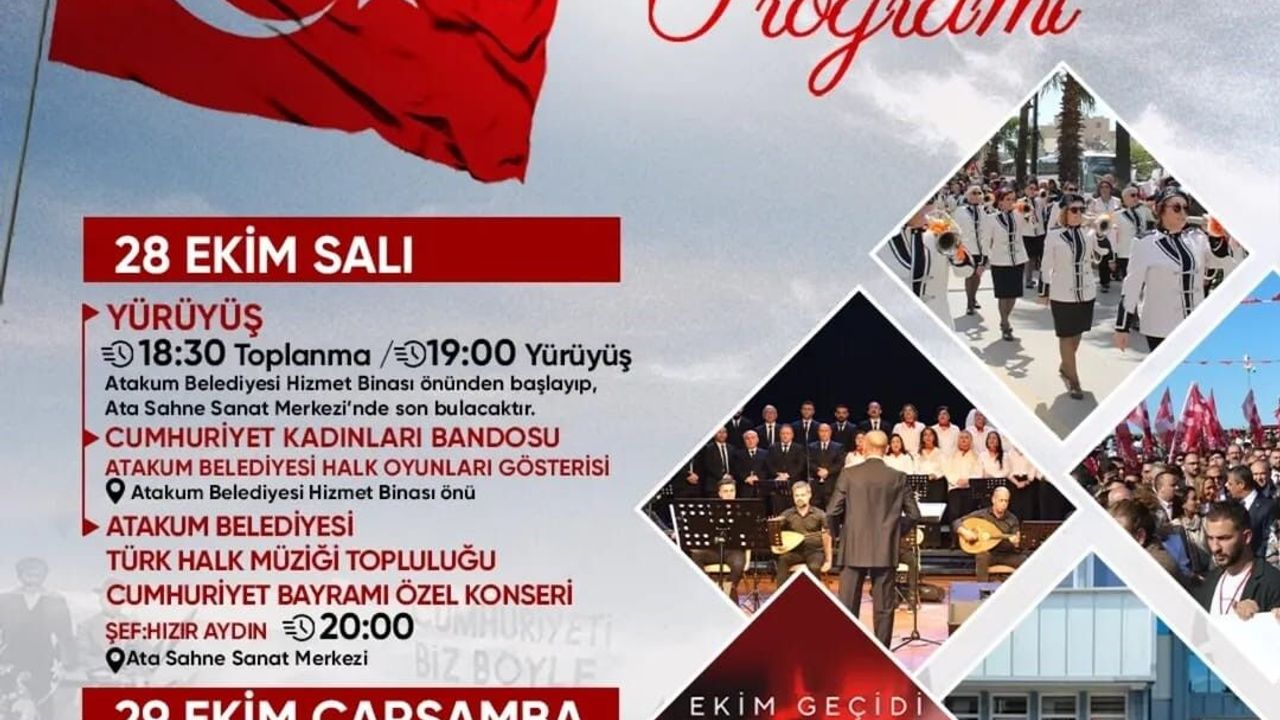Atakum Belediyesi’nin 29 Ekim Cumhuriyet Bayramı kutlamaları, 28 Ekim Salı günü saat 19.00’da belediye hizmet binası önünden başlayacak "Cumhuriyet Yürüyüşü" ile başlayacak. Cumhuriyet Kadınları Bandosu eşliğinde gerçekleşecek kortej, Ata Sahne Sanat Merkezi’ne kadar devam edecek. Yürüyüşün ardından, Atakum Belediyesi Türk Halk Müziği Topluluğu Şefi Hızır Aydın yönetiminde sahne alacak koro, saat 20.00’de başlayacak konserde seçkin eserleri seslendirecek.