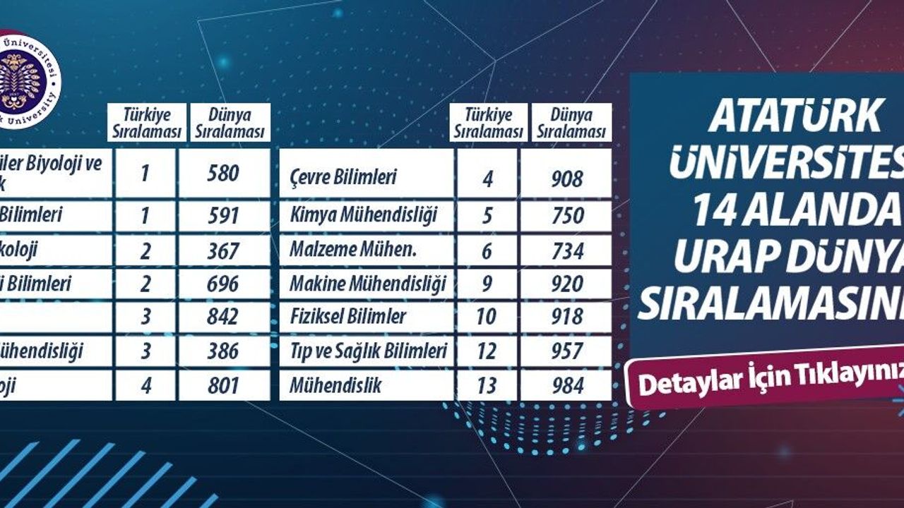Atatürk Üniversitesi, ODTÜ University Ranking by Academic Performance (URAP) tarafından açıklanan 2025 yılı alan bazlı sıralama sonuçlarına göre ulusal ve uluslararası düzeyde önemli başarılar elde etti. Toplam 14 farklı akademik alanda değerlendirilen üniversite, hem Türkiye sıralamalarında üst sıralarda yer alma başarısı gösterdi hem de birçok alanda dünya sıralamasında anlamlı yükselişini sürdürdü. Ayrıca 14 farklı alanda yer alan Atatürk Üniversitesi, 8. sırada yer alarak ülke yükseköğretiminde en fazla alanda sıralamaya giren üniversitelerden birisi oldu.