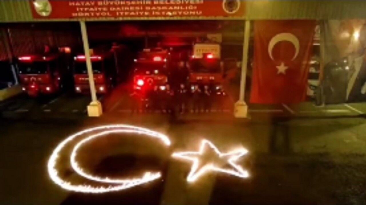 Hatay’da itfaiye ekipleri, 29 Ekim Cumhuriyet Bayramı’nı alevlerle oluşturdukları ay yıldızlı hilalle kutladılar.
