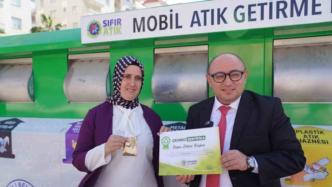 Mersin Erdemli Belediyesi Sıfır Atık Projesi kapsamında başlattığı ‘Atığını Getir, Altınını Götür’ kampanyasına katılan ve en çok puan toplayan 3 çocuk annesi Zehra Doğan altın kazandı.