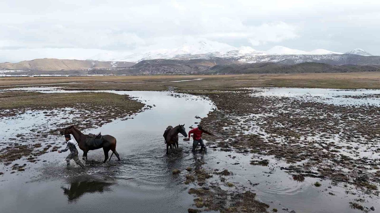 Kayseri'de iki doğaseverin atla olan gezisi görünmeyen bir kaza nedeniyle suda biterken, o anlar dron kamerasına yansıdı.