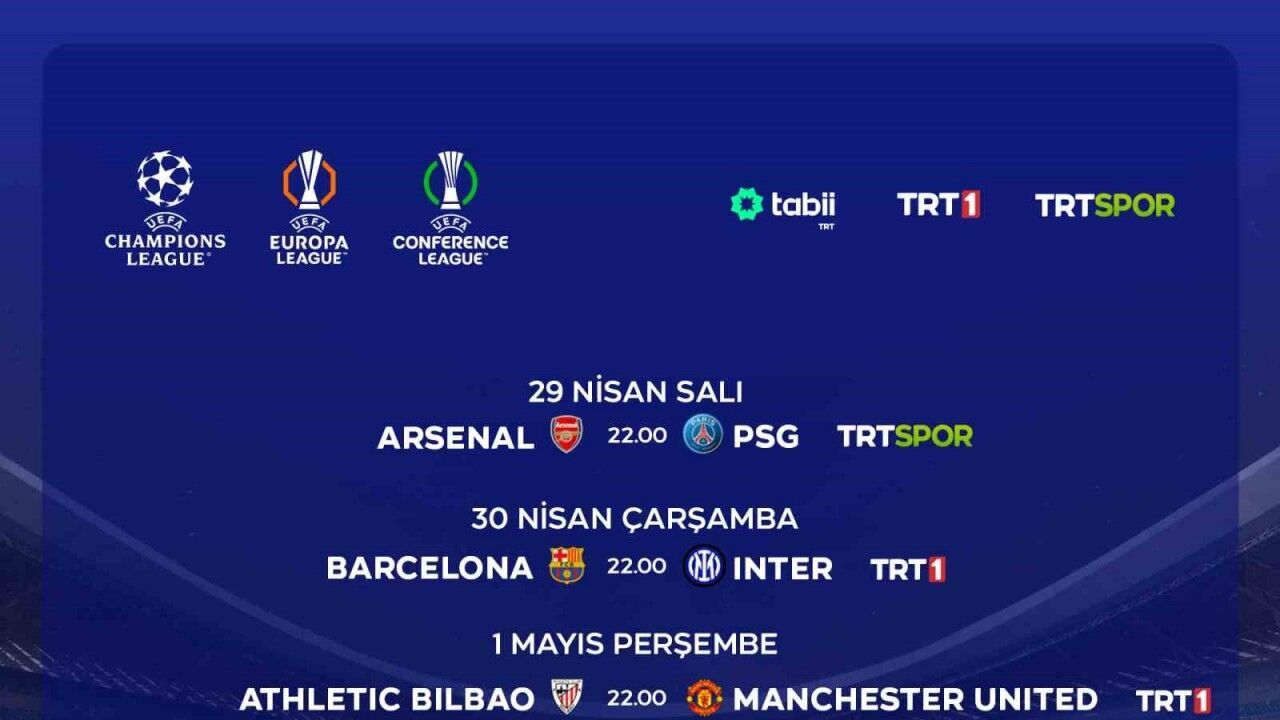 UEFA Şampiyonlar Ligi, Avrupa Ligi ve Konferans Ligi’nde yarı final kapsamında 29 Nisan-1 Mayıs tarihlerinde oynanacak 6 karşılaşma, TRT 1, TRT Spor ve tabii platformunda futbolseverlerle buluşacak.