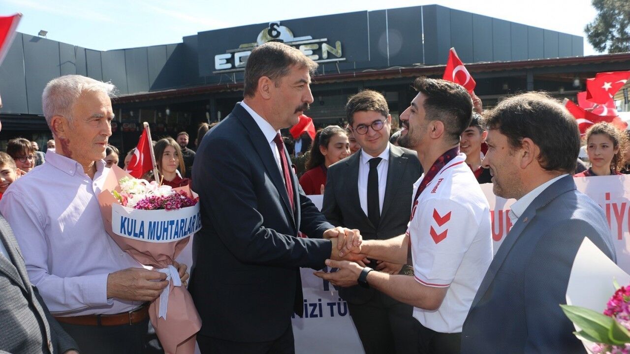 Şampiyon güreşçi Kerem Kamal, beden eğitimi öğretmenliği görevini de sürdürdüğü Kula’da, sevenleri tarafından adeta bir kahraman gibi karşılandı. İlk olarak Egemen Dinlenme Tesisleri’nde yoğun bir kalabalık tarafından alkışlar ve tezahüratlarla karşılanan Kamal’a, Kula Yaren Ekibi eşlik etti. Kamal, Yaren ekibi eşliğinde şehir turu atarak hemşehrilerini selamladı. Şehir turunun ardından Kerem Kamal, görev yaptığı Fatih Ortaokulu’na geçti. Burada öğretmen arkadaşları ve öğrenciler tarafından büyük bir sevgi seliyle karşılanan Kamal’a, okul müdürü Güngör Zobudoğuş tarafından çiçek takdim edildi. Törende duygu dolu anlar yaşanırken, Kamal’ın başarısı öğrencilere ilham kaynağı oldu.