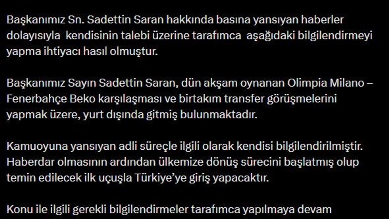 Avukat Ali Alper Alpoğlu, İstanbul Cumhuriyet Başsavcılığı tarafından yürütülen uyuşturucu soruşturması kapsamında ifadeye çağırılan Fenerbahçe Spor Kulübü Başkanı Sadettin Saran ile ilgili yazılı açıklama yaptı. Saran’ın ilk uçakla Türkiye’ye giriş yapacağını belirten Alpoğlu, "Başkanımız Sadettin Saran hakkında basına yansıyan haberler dolayısıyla kendisinin talebi üzerine tarafımca aşağıdaki bilgilendirmeyi yapma ihtiyacı hasıl olmuştur. Başkanımız Sayın Sadettin Saran, dün akşam oynanan Olimpia Milano-Fenerbahçe Beko karşılaşması ve birtakım transfer görüşmelerini yapmak üzere, yurt dışında gitmiş bulunmaktadır. Kamuoyuna yansıyan adli süreçle ilgili olarak kendisi bilgilendirilmiştir. Haberdar olmasının ardından ülkemize dönüş sürecini başlatmış olup temin edilecek ilk uçuşla Türkiye’ye giriş yapacaktır. Konu ile ilgili gerekli bilgilendirmeler tarafımca yapılmaya devam edilecektir" ifadelerine yer verdi.