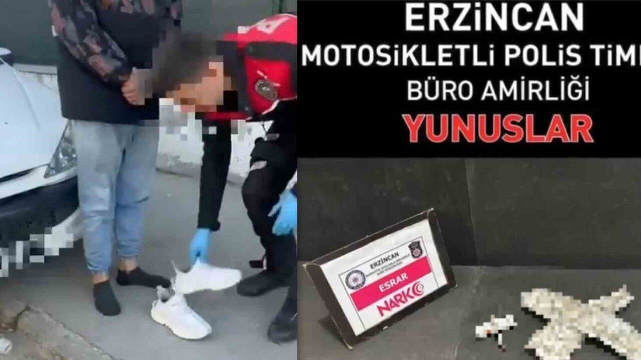 Erzincan’da motosikletli polis ekiplerinin şüphe üzerine durdurduğu araçta, sürücünün ayakkabısının keçe altına gizlenmiş 92 gram toz esrar ele geçirildi.
