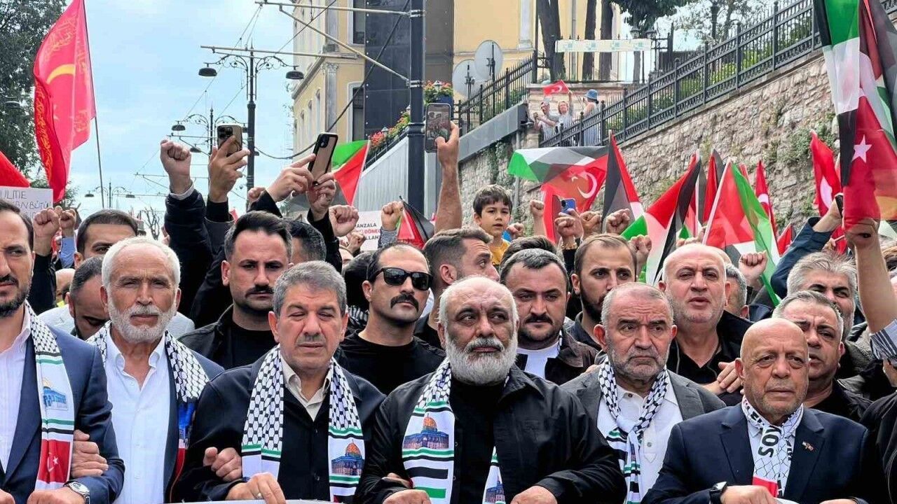 İsrail’in Filistin’e yönelik uyguladığı soykırım nedeniyle İstanbul’da yüzlerce kişi, Ayasofya Meydanı’ndan Eminönü Meydanı’na yürüyüşe geçti.