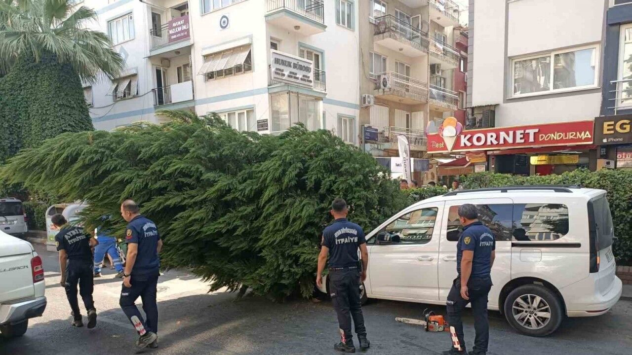 Aydın’ın Efeler ilçesinde kökü kuruyan bir ağaç, park halindeki bir aracın üzerine devrildi.
