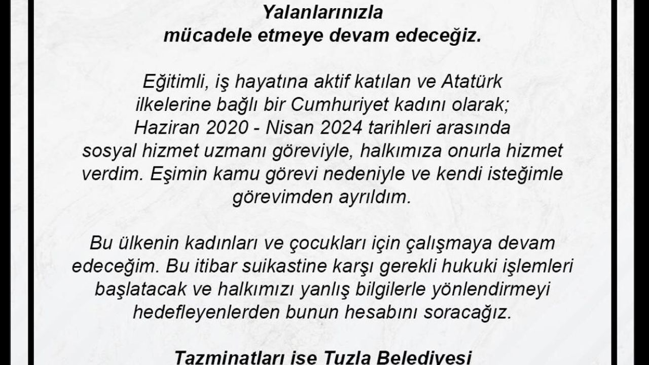 Ayşegül Kılınç Bingöl, hakkında çıkan iddialara sosyal medya hesaplarından cevap verdi. Ayşegül Kılınç Bingöl, “Yalanlarınızla mücadele etmeye devam edeceğiz. Eğitimli, iş hayatına aktif katılan ve Atatürk ilkelerine bağlı bir cumhuriyet kadını olarak Haziran 2020 - Nisan 2024 tarihleri arasında sosyal hizmet uzmanı göreviyle, halkımıza onurla hizmet verdim. Eşimin kamu görevi nedeniyle ve kendi isteğimle görevimden ayrıldım. Bu ülkenin kadınları ve çocukları için çalışmaya devam edeceğim. Bu itibar suikastına karşı gerekli hukuki işlemleri başlatacak ve halkımızı yanlış bilgilerle yönlendirmeyi hedefleyenlerden bunun hesabını soracağız. Tazminatları ise Tuzla Belediyesi Sosyal Yardım İşleri Müdürlüğü’ne bağışlayacağız” ifadelerini kullandı.