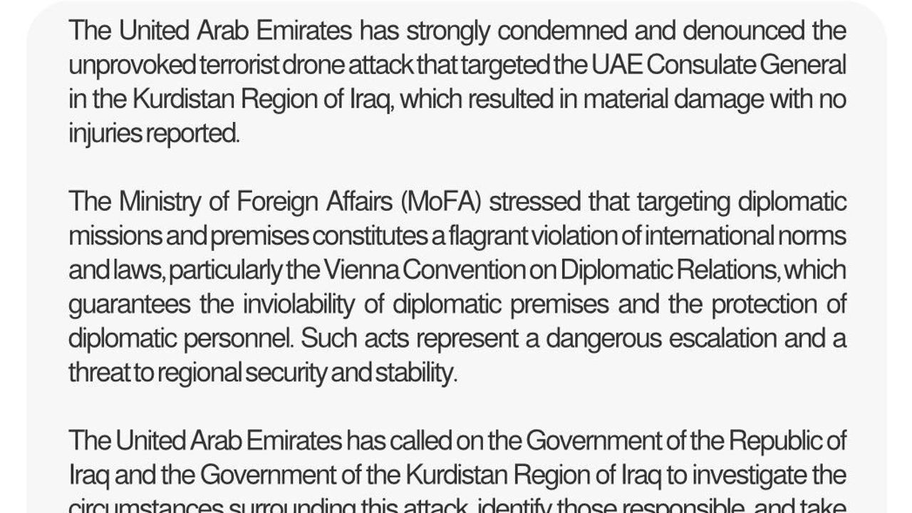 Irak hükümeti ve Kürt Bölgesel Yönetimi'ne saldırıyı soruşturma, faillerin hesap vermesini sağlama ve gerekli tüm önlemleri alma çağrısı yapıldı. BAE'nin güvenlik ve istikrarı baltalamayı amaçlayan bu tür saldırıları kesin bir dille reddettiğini yinelenerek, diplomatik misyonların ve personelin uluslararası hukuk ve normlara uygun şekilde korunması gerektiği vurgulandı.