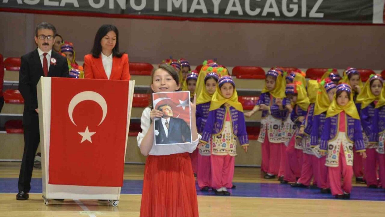 Saat 09.00’da İlçe Milli Eğitim Müdürü Mehmet Değermenci tarafından Kent Meydanı’nda Atatürk Anıtı’na çelenk konulmasıyla başlayan 23 Nisan kutlamaları, kapalı spor salonunda devam etti.