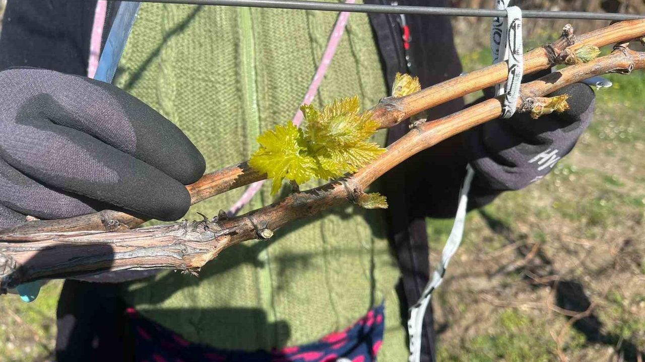 Sarıgöl'ün Tırazlar Mahallesi'nde 25 dekarlık erkenci Süperyol üzüm bağı bulunan üretici Aytaç Ünlükoç, çubuk bağlama çalışması yaptığı sırada bağ çubuklarındaki gözlerin patladığını ve yaprakların belirgin şekilde ortaya çıktığını fark etti.