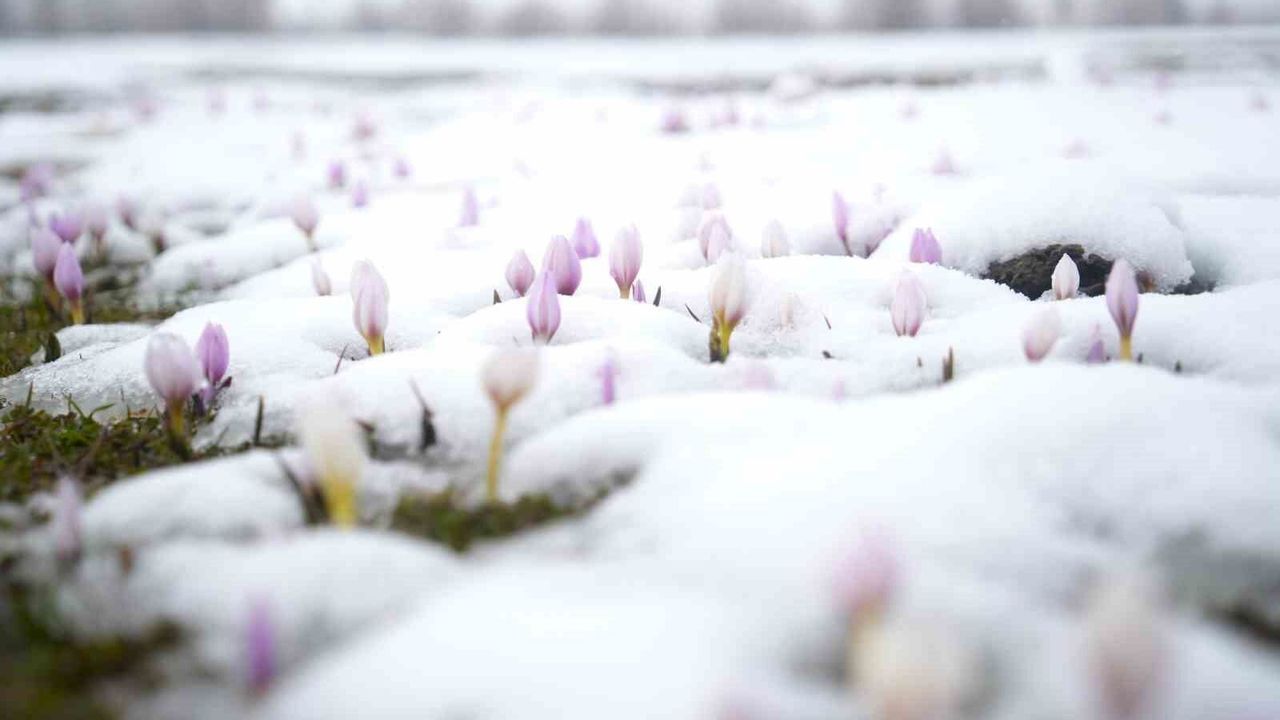 Muş Ovası'nda havaların ısınmasıyla açan çiğdemler, ani bastıran kar yağışının ardından beyaz örtüyle kaplanırken, ortaya güzel manzaralar çıktı.
