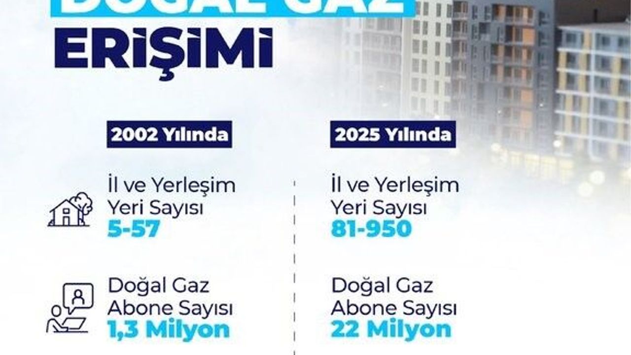 Bakan Bayraktar, doğal gazda Türkiye genelinde konut abone sayısının 1 milyon arttığını belirterek, "2002 yılında sadece 5 ilde ve 57 yerleşim yerinde olan doğal gazı, inşa ettiğimiz 243 bin kilometrelik iletim ve dağıtım şebekemizle 81 il, 950 yerleşim yeri ve 229 OSB’ye ulaştırdık. 2002’de 1,3 milyon olan doğal gaz abone sayısı, bugün itibari ile 22 milyona yükseldi. Sadece 2025 yılında 15 bin 600 kilometre doğal gaz dağıtım ve iletim hattı inşa ettik. Böylece, son bir yılda 51 yerleşim yerine doğal gaz arzı sağladık ve Türkiye genelinde konut abone sayısı da yaklaşık 1 milyon arttı. Doğal gaz ulaştırılan yerleşim yeri sayısını 2025 sonunda 973’e çıkaracağız. Gerçekleştirdiğimiz doğal gaz dönüşümü sayesinde yıllık 34 milyon ton karbon emisyonunu engelliyoruz. Ayrıca, kükürt kaynaklı kirlilik oluşumunu da önlüyoruz. Türkiye’de halihazırda 4 milyon hane, yerli doğal gazımızı kullanıyor. 2028’de bunu 4 katına çıkararak 16 milyon hanenin yerli doğal gazımızı kullanmasını sağlayacağız" ifadelerini kullandı.