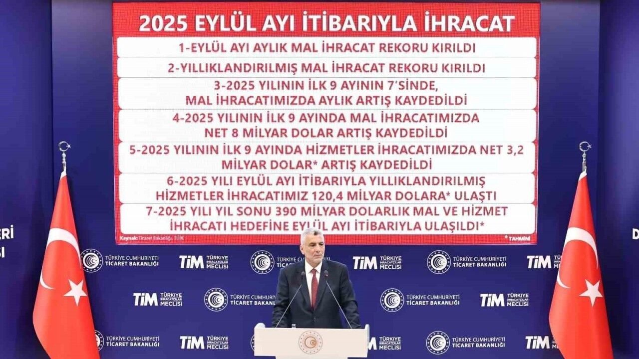 Ticaret Bakanı Ömer Bolat, Eylül ayı dış ticaret verilerine ilişkin, "Eylül ayı mal ihracat rekoru kırdık. Yıllıklandırılmış mal ihracatında da rekor bir rakama ulaştık. 2025 yılının ilk 9 ayının 7’sinde mal ihracatımızda aylık artış başarıldı" dedi.
