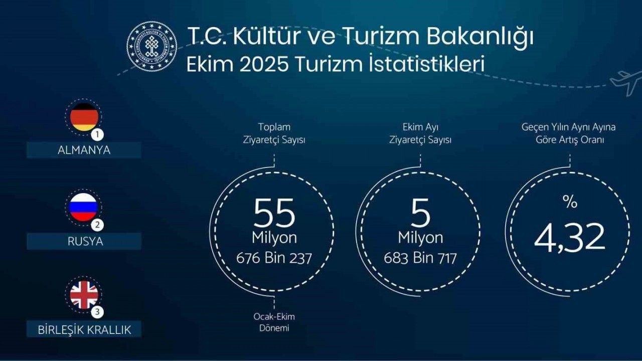 "Ekim ayında en çok ziyaretçi gönderen ülkeler arasında Almanya ve Rusya Federasyonu ilk iki sıradaki yerini korurken, Birleşik Krallık üçüncü sırada yer aldı. Almanya’dan gelen ziyaretçiler yüzde 6,20, Rusya Federasyonu’ndan gelen ziyaretçiler ise yüzde 11,44 oranında artış gösterdi. Yılın ilk on ayında toplam ziyaretçi sayımız 55 milyon 676 bin 237, yabancı ziyaretçi sayımız ise 47 milyon 252 bin 314 oldu. Bu ziyaretçilerin yüzde 96,20’sinin kültür, gezi ve tatil amacıyla ülkemizi tercih etmesi, Türkiye’nin global turizmdeki güçlü konumunu bir kez daha teyit ediyor. Türkiye; turizm çeşitliliği, hizmet kalitesi ve dünya çapındaki marka değeriyle yükselen bir başarı grafiği çizmeye devam ediyor."