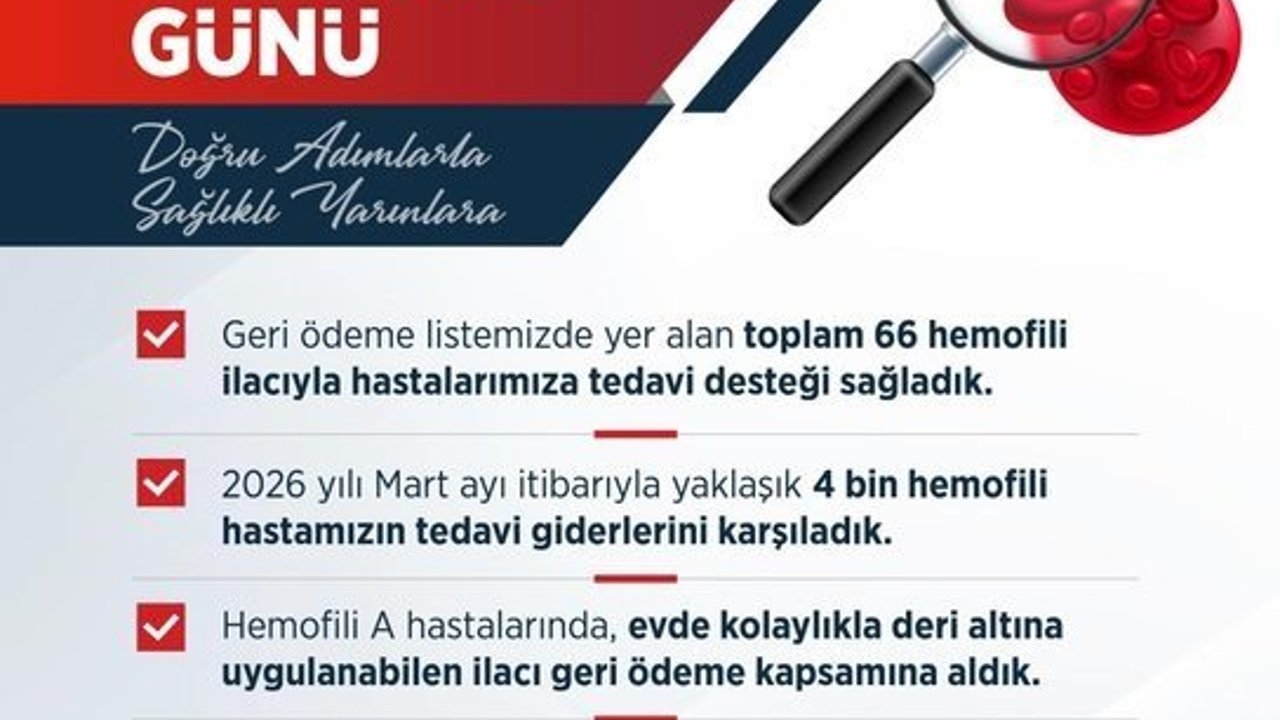 Çalışma ve Sosyal Güvenlik Bakanı Vedat Işıkhan, Mart ayında 4 bin hemofili hastasının tedavi ihtiyaçlarını karşıladıklarını belirterek, 'Geri ödeme listemizde yer alan 66 hemofili ilacı sayesinde tedavi yöntemlerine erişimi kolaylaştırdık. 2026 yılı Mart ayı itibarıyla 4 bin hemofili hastamızın tedavi giderlerini karşıladık' dedi.