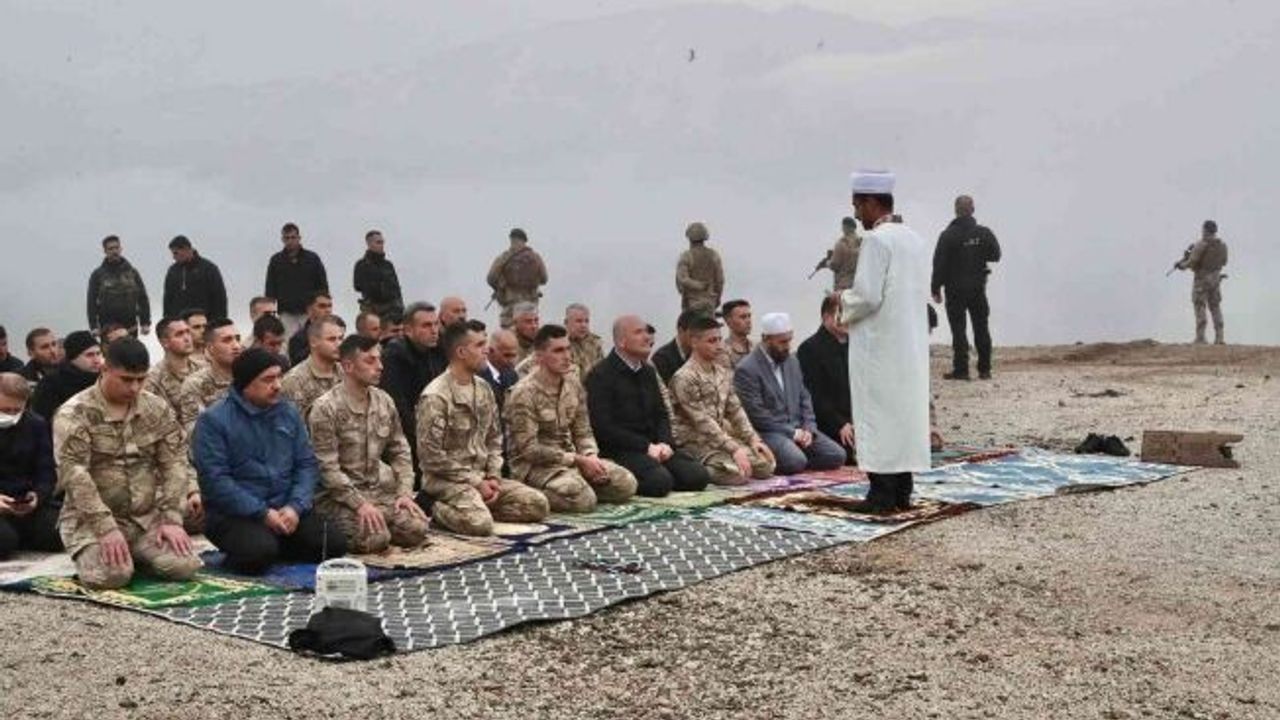 İçişleri Bakanı Süleyman Soylu, Ramazan Bayramı namazını Hakkari Yüksekova İran sınırındaki 2 bin 100 rakımlı Zirvin Tepe Üs Bölgesi’ndeki Mehmetçikle kıldı.