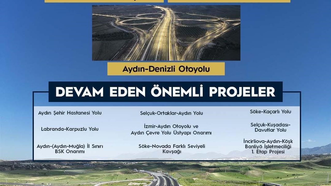 Öte yandan kent genelinde devam eden önemli projeler arasında, Aydın Şehir Hastanesi Yolu, Selçuk-Ortaklar-Aydın Yolu, Söke-Kaçarlı Yolu, Selçuk-Kuşadası-Davutlar Yolu, Labranda-Karpuzlu Yolu ile İzmir-Aydın Otoyolu ve Aydın Çevre Yolu üstyapı onarımı yer aldı. Ayrıca Aydın-(Aydın-Muğla) il sınırı BSK onarımı, Söke-Novada farklı seviyeli kavşağı ve İncirliova-Aydın-Köşk Banliyö İşletmeciliği 1. etap projesinin de sürdüğü bildirildi.