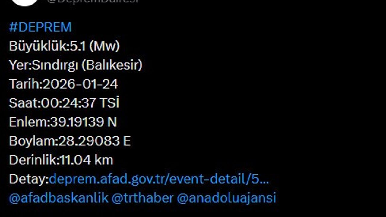 Balıkesir'de neydana gelen 5.1 büyüklüğündeki deprem sonrasında Vali İsmail Ustaoğlu, sosyal medya hesaplarından açıklamada bulundu. Ustaoğlu, 'An itibarı ile olumsuz bir durum yoktur. AFAD ve ilgili kurumlarımızın saha taramaları devam etmektedir' açıklamasında bulundu.