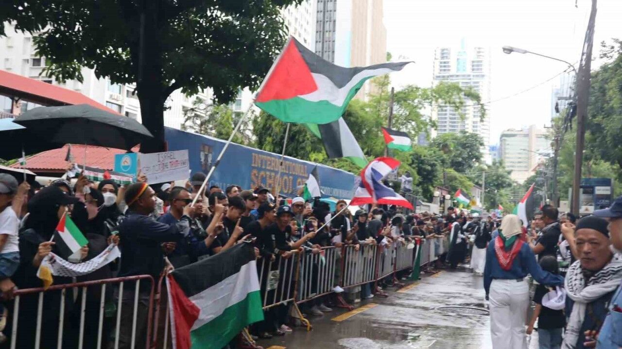 Tayland’ın başkenti Bangkok’ta çok sayıda kişi, İsrail’in Gazze Şeridi’ndeki saldırılarını kınamak ve Filistin halkına destek vermek amacıyla İsrail Büyükelçiliği önünde protesto gösterisi düzenledi.
