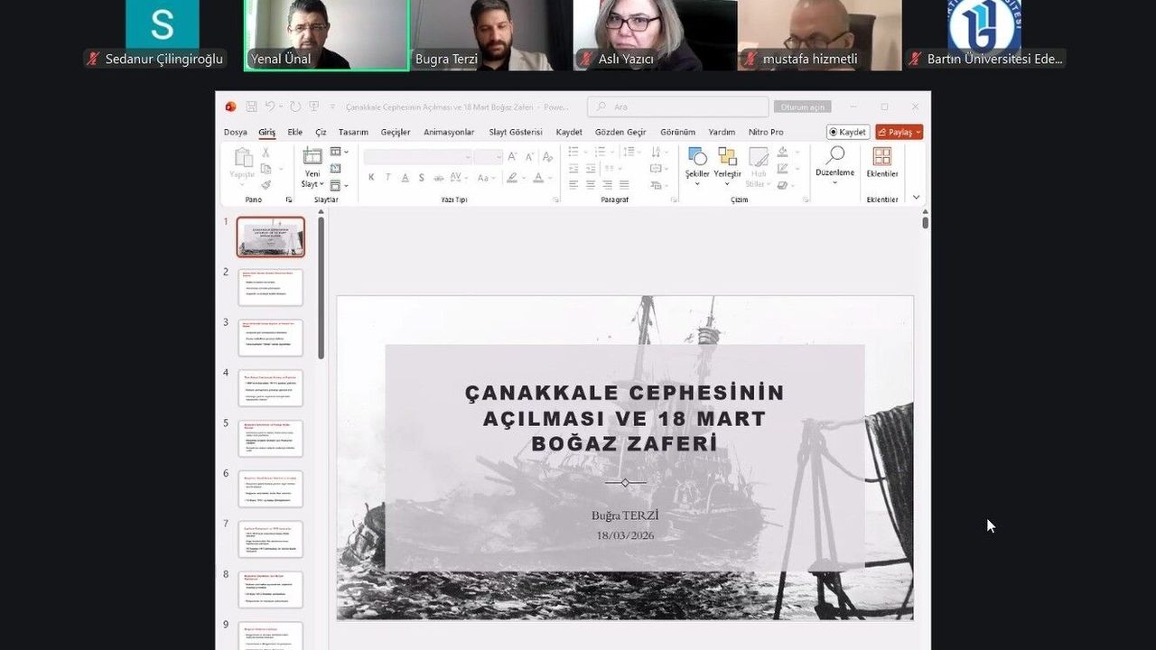Bartın Üniversitesinde (BARÜ) düzenlenen etkinlikte Çanakkale cephesinin açılmasından 18 Mart Çanakkale Zaferi'ne uzanan süreç askerî ve stratejik boyutlarıyla ele alındı.