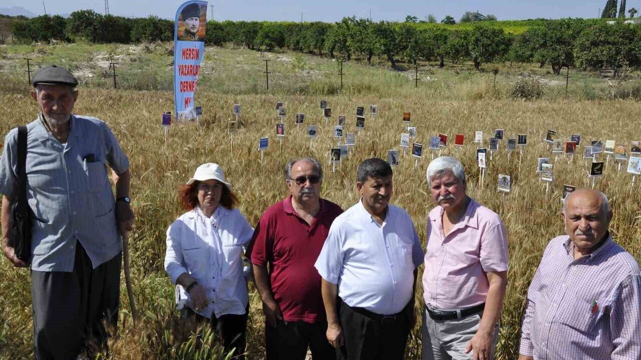 Mersin Yazarlar Derneği üyeleri, kitap okuma alışkanlığına dikkat çekmek ve farkındalık oluşturmak amacıyla buğday tarlasındaki başaklara kitap astı.