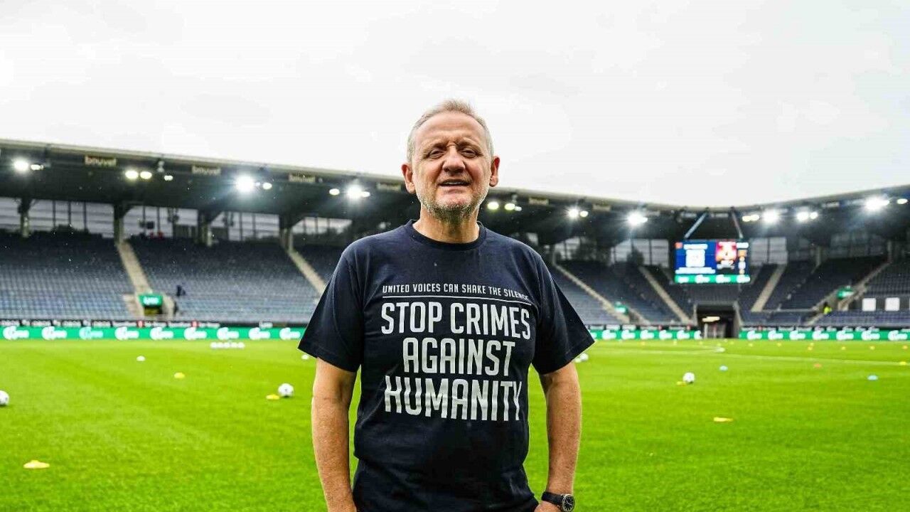 Başkanımız Göksel Gümüşdağ ve futbolcularımız, Viking FK ile oynayacağımız maça ’İnsanlığa karşı işlenen suçlara son verin’ yazılı tişörtlerle çıktı" denildi.