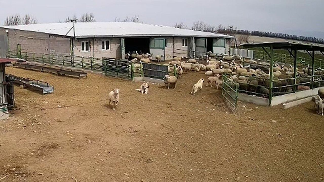 Konya'nın Karapınar ilçesinde bir çiftliğe giren sokak köpeği koyunları kovalarken, çiftlikte bulunan çoban köpeği olanları yattığı yerden kıpırdamadan izledi.