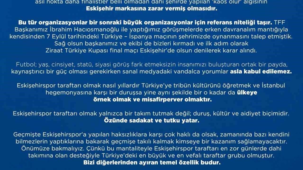Başkan Albayrak, şehrin ve takımın geleceği için çaba göstermeye devam edeceğini vurgulayarak,"Geçtiğimiz gün, Ziraat Türkiye Kupası finalinin şehrimizde olacağı duyurulmasının ardından konu epeyce gündem oldu. Haddini aşmayan eleştiriler başımızın tacı. Ancak, haddini aşan bazı yorum yapanlarla tek merkezden yönetilerek olayı farklı yerlere çabasında olan sözde danışmanlar ve ekürileri sizler Eskişehir’e ihanet eden toksik tiplersiniz... Eskişehirspor taraftarı bir vatandaş olarak, Eskişehirspor’umuzun ve şehrimizin geleceği için elimden geleni her fırsatta yapma çabası içerisindeyim, olmaya da devam edeceğim. Bizi üzen asıl nokta daha finalistler belli olmadan dahi şehirde yapılan ’kaos olur’ algısının Eskişehir markasına zarar vermiş olmasıdır" dedi.