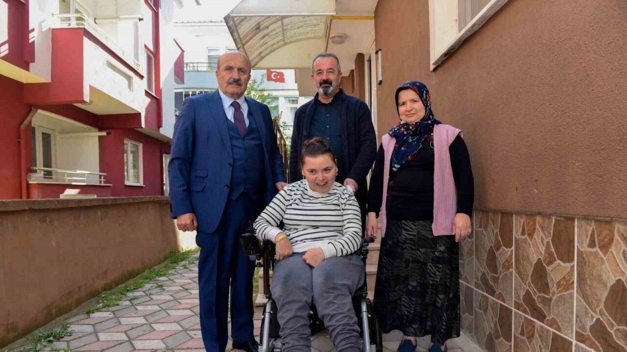 Taşköprü Belediye Başkanı Hüseyin Arslan, özel birey Nurcan Kaya’yı evinde ziyaret ederek, akülü tekerlekli sandalye teslim etti.