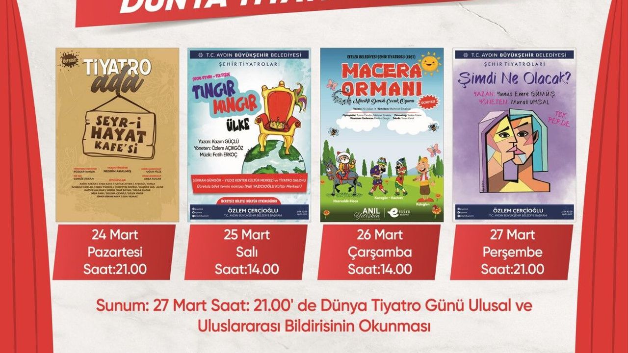 Aydın Büyükşehir Belediyesi, 27 Mart Dünya Tiyatro Günü nedeniyle Aydınlı tiyatroseverleri birbirinden güzel eserler ile buluşturacak. Bugüne kadar her yaştan binlerce tiyatroseveri sevilen eserler ile buluşturan Büyükşehir Belediyesi Şehir Tiyatroları, 24-27 Mart tarihleri arasında 4 farklı oyun ile 7’den 70’e her yaştan Aydınlı için perdelerini açacak. ‘Dünya Tiyatro Haftası’ etkinlikleri için ücretsiz biletler Vali Yazıcıoğlu Kültür Merkezi’nden temin edilebilecek.