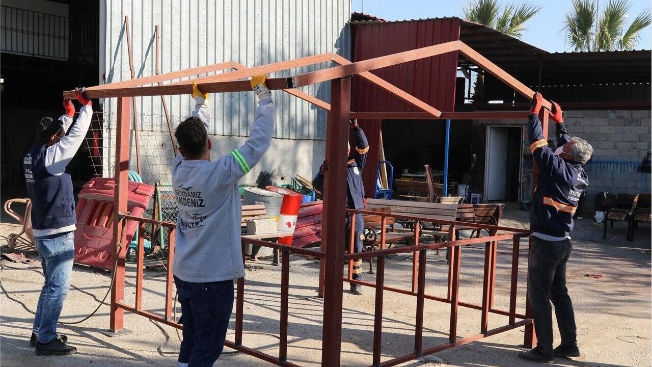 Gerek vatandaşlardan gelen talep ve şikayetler, gerekse sahada yaptıkları incelemeler neticesinde zaman içinde zarar gören veya miladını dolduran bankları, kamelyalar ile çöp kutularını da bulundukları yerlerden alarak müdürlüğe ait fidanlıktaki atölyelerde elden geçiren Akdeniz Belediyesi Park ve Bahçeler Müdürlüğü ekipleri, park ve yeşil alanların ihtiyaç duyduğu her türlü mobilyayı da belediyenin öz kaynakları ile üretiyor.