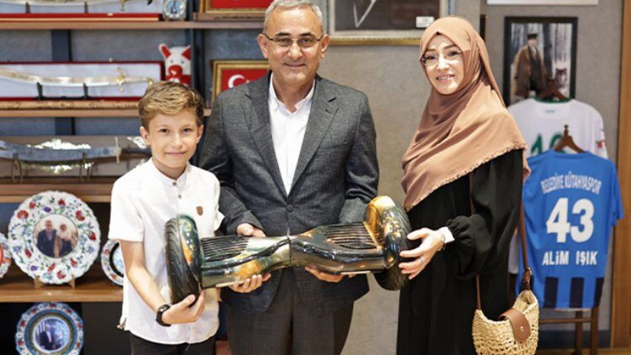 Hatırlanacağı gibi Kütahyalı minik hemşehrimiz Ömer Faruk da Belediye Başkanı Prof. Dr. Alim Işık’a elektrikli kaykay almak için kumbarasında biriktirdiği parayı teslim ederek depremzede çocuklar için bağışlamıştı. Ömer Faruk’un bu davranışı karşısında duygulanan Başkan Işık, Ömer Faruk’un hayali olan elektrikli kaykayı alıp kendisine hediye edeceğinin sözünü vermişti. Belediye Başkanı Prof. Dr. Alim Işık, sözünü verdiği elektrikli kaykayı alarak Ömer Faruk’u makamına davet etti ve hediyesini takdim etti.