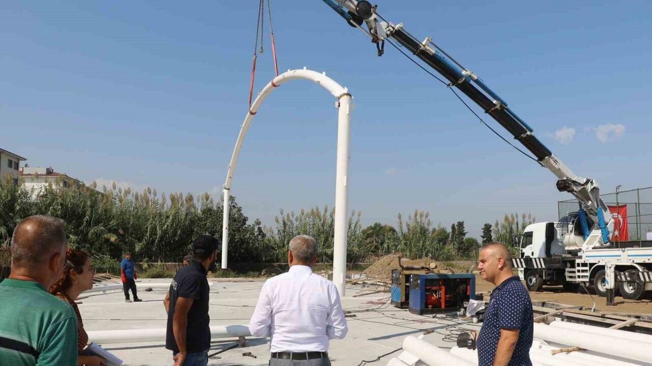 Yüzme Havuzu ile ilgili açıklama yapan Başkan Kaplan, “Kapalı yarı olimpik portatif yüzme havuzu zemin etüdü yapıldı. Beton dökümü gerçekleşti. Şimdi ise çelik konstrüksiyonların montajına başlandı. Yüzme havuzu tüm vatandaşlarımıza hizmet verecek şekilde tasarlanıyor. Çocuklarımız, gençlerimiz ve engellilerimizin bütün ihtiyaçları düşünüldü. Tamamı çelik konstrüksiyondan oluşuyor. İlçemize yakışır bir yüzme havuzu kısa zamanda faaliyete geçecek” dedi.