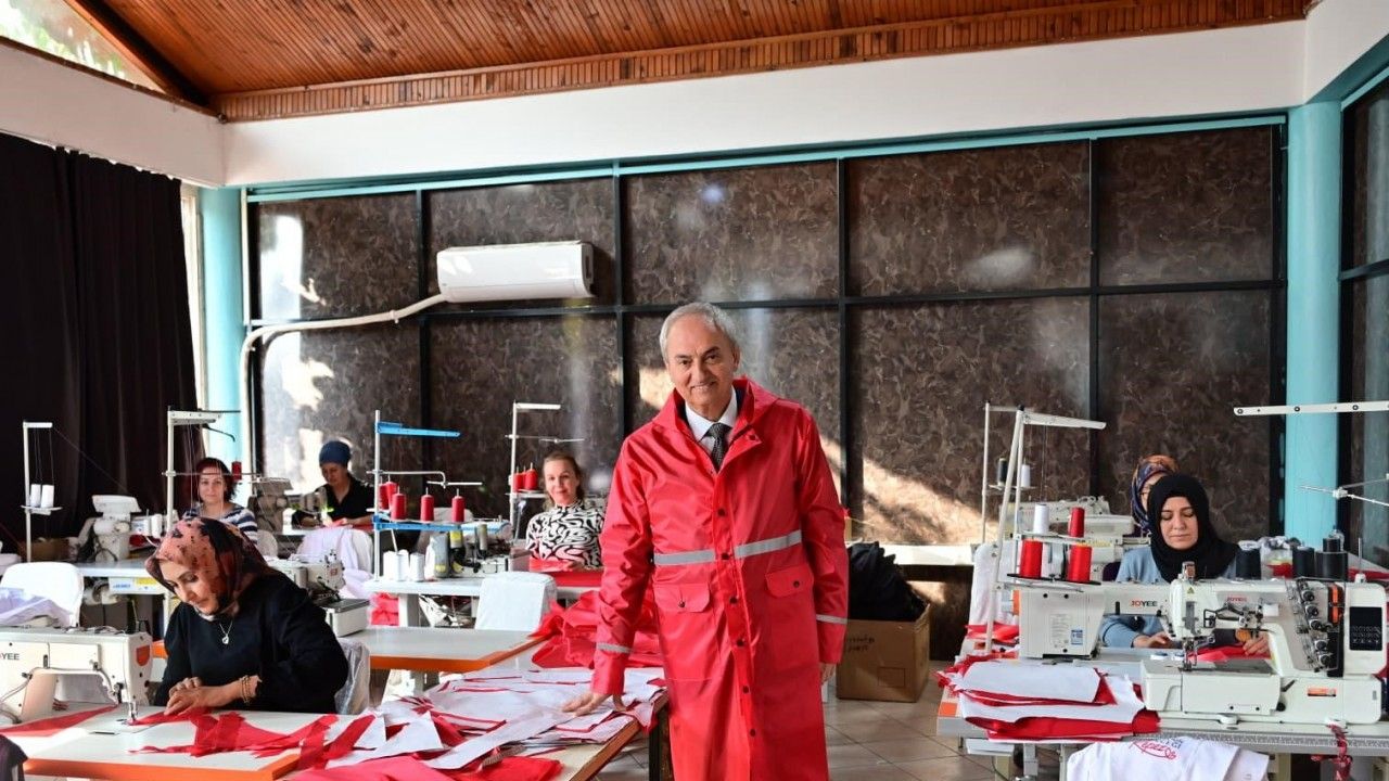 Kepez Belediye Başkanı Mesut Kocagöz, üretim gücüyle sosyal belediyeciliğe örnek teşkil eden ve kadın emeğiyle büyüyen belediyenin tekstil atölyesini ziyaret etti. Arazide görev yapan personeli yağışlardan koruması için hazırlanan yağmurlukları inceleyen Başkan Kocagöz, bir tanesini üzerine giyerek ürünün işlevini bizzat test etti.