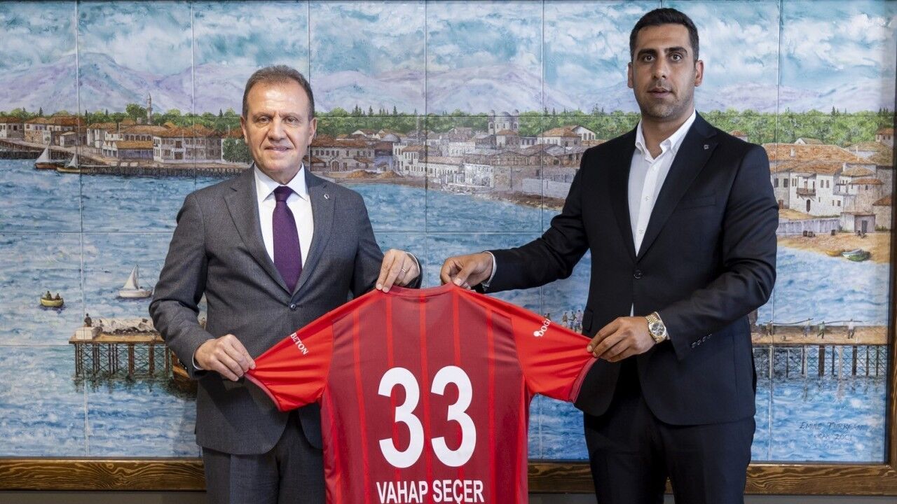 Özdemir ve yönetim kurulu üyeleri, ziyaret sonunda Başkan Seçer’e 33 numaralı üzerinde ’Vahap Seçer’ yazan takımın forması ile formanın yer aldığı tablo hediye etti.