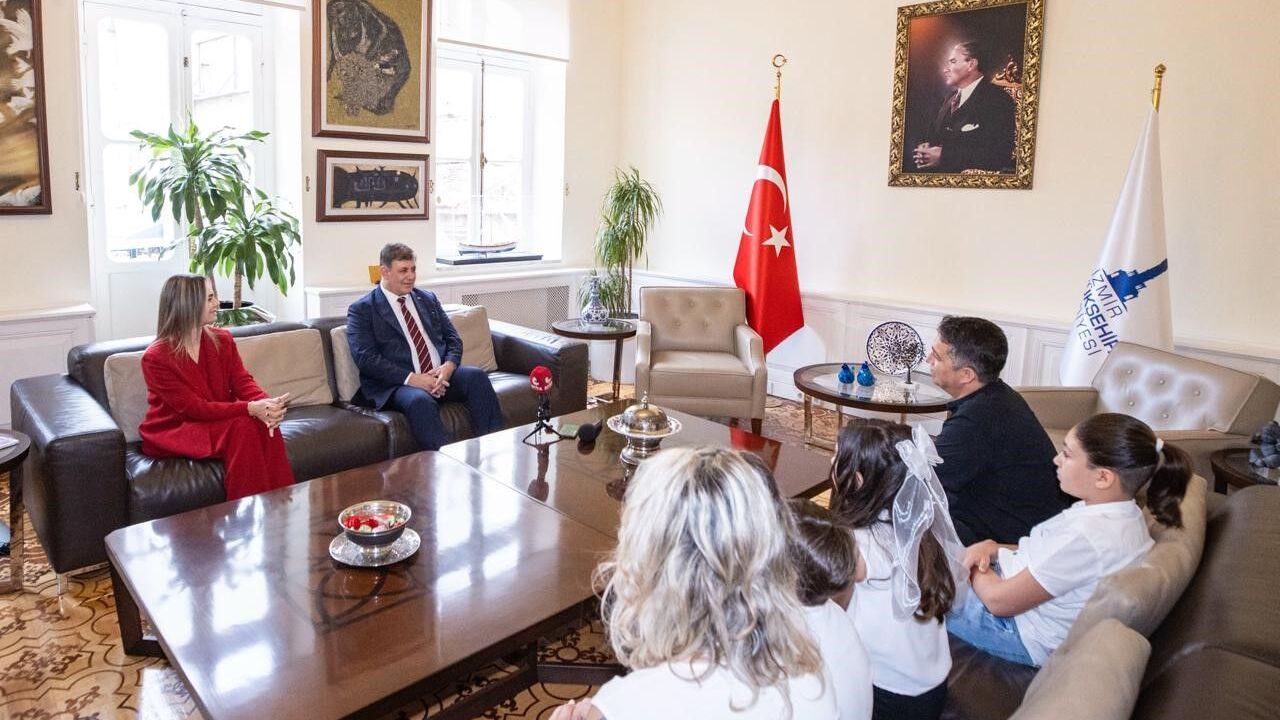 İzmir Büyükşehir Belediye Başkanı Dr. Cemil Tugay, Ulu Önder Mustafa Kemal Atatürk’ün tüm dünya çocuklarına miras bıraktığı 23 Nisan Ulusal Egemenlik ve Çocuk Bayramı’nda koltuğunu Konak Mehmet Akif Ersoy İlkokulu dördüncü sınıf öğrencisi Alya Ada Nizamoğlu’na devretti. Makamında eşi Öznur Tugay ile birlikte baba Onur Nizamoğlu, anne Ebru Nizamoğlu ve Alya Ada’nın kardeşleri Kemal Deniz ve Mustafa Güneş’i ağırlayan Başkan Dr. Cemil Tugay aileyle sohbet etti.