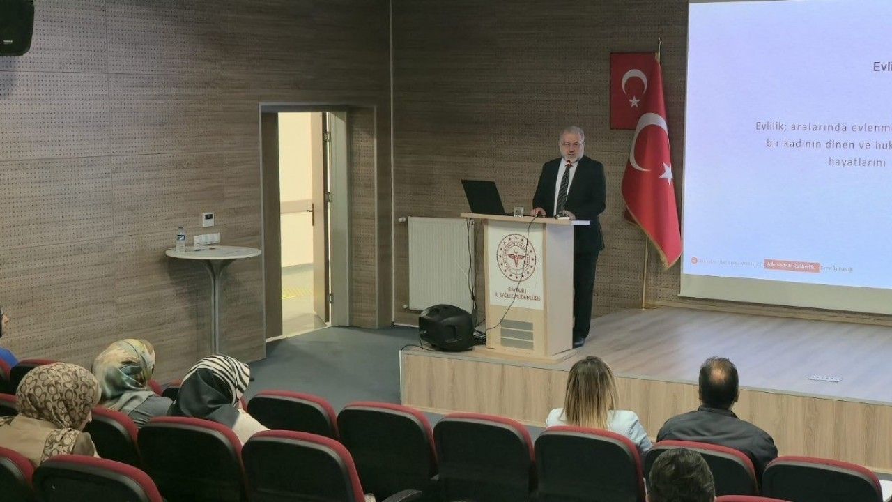 Bayburt İl Sağlık Müdürlüğü personeline yönelik gerçekleştirilen seminerde, Müftü Yardımcısı Nurettin Akgül, Kur’an ve sünnet ışığında yuva kurmanın önemini anlattı. Katılımcılar, evliliğin aile ve toplum üzerindeki etkileri ile neslin korunmasındaki rolü hakkında bilgilendirildi.