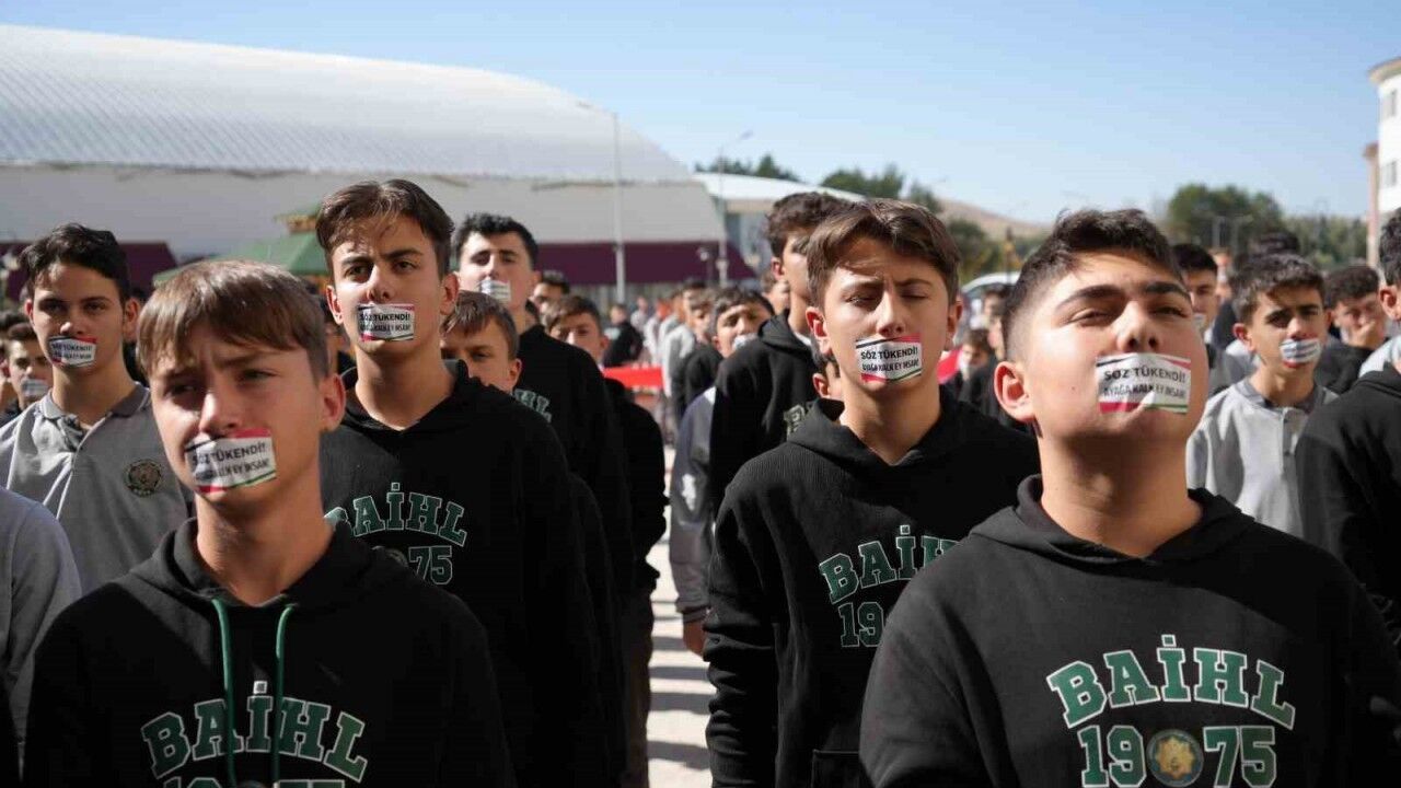 Etkinlikte öğrenciler ağızlarına ’Söz tükendi! ayağa kalk ey insan’ yazılı bantlar yapıştırarak, İsrail’in Gazze’de uyguladığı soykırımı protesto etti. Okul bahçesinde gerçekleştirilen etkinliğe öğrencilerin yanı sıra öğretmenler, okul idaresi ve personel de katıldı.