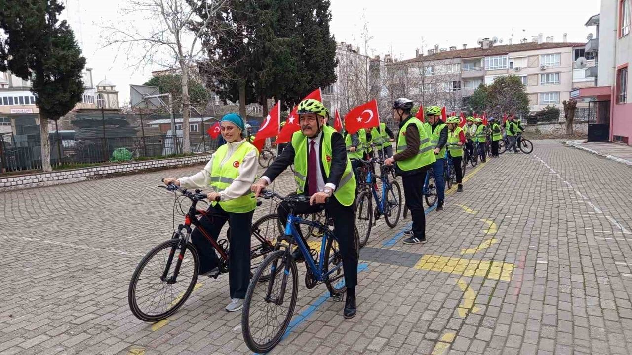 Aydın'ın Efeler ilçesinde 'İstiklal Bayrakla, İstikbal Maarifle' temasıyla düzenlenen bisiklet sürüş etkinliğinde öğrenciler, Türk bayrağının manevi değerine dikkat çekmek için pedal çevirdi.
