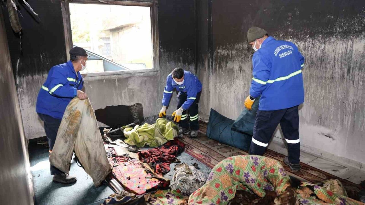 Mersin'in Akdeniz ilçesine bağlı Güneş Mahallesi'nde çıkan yangında zarar gören ev, belediye ekiplerinin yürüttüğü temizlik ve tahliye çalışmasıyla yeniden yaşanabilir hale getirilmeye çalışıldı. Çalışmalar sırasında bulunan nakit para ve banka kartları ise tutanakla ev sahibine teslim edildi.