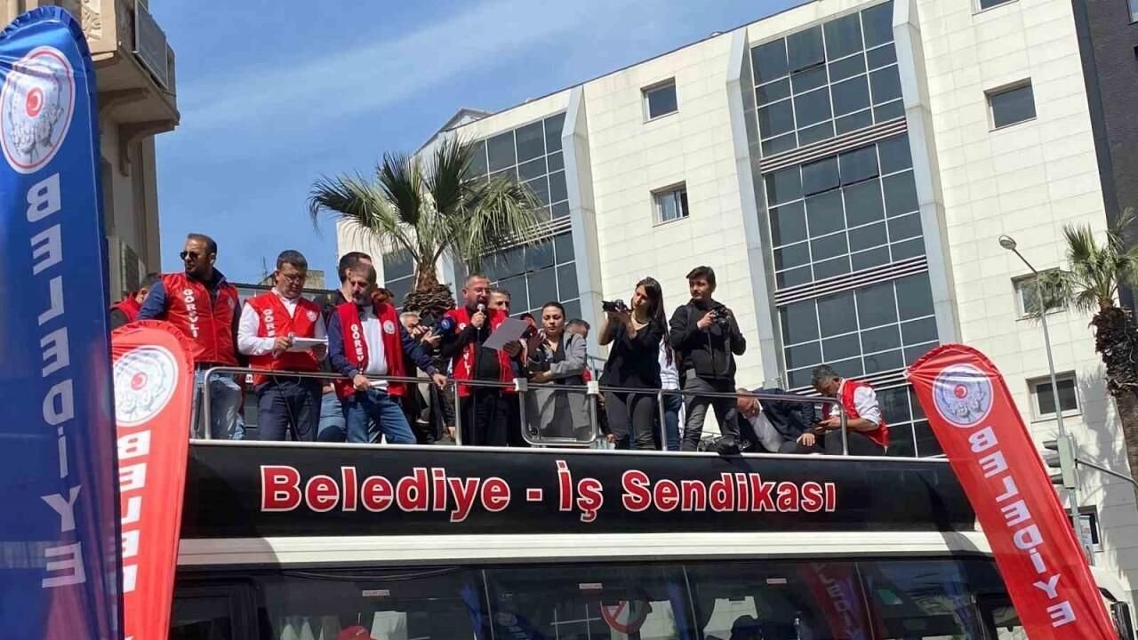Belediye-İş Sendikası ile İzmir Büyükşehir Belediyesi arasında devam eden TİS görüşmelerimin tıkanması sonucu yaklaşık 6 bin işçi eyleme çıktı. İzmir Büyükşehir Belediyesi Egemenlik Evi Binası önüne basın açıklaması yapan, “Emekçiler, alın terinin karşılığını almak için iki ayı aşkın süredir belediye yönetimi ile görüşüyor. Ancak emekçinin yaşadığı geçim sıkıntısını görmüyorlar. Belediye yönetiminin sorunlarımıza karşı duyarsızlığı karşısında öfkeleniyoruz. Biz emekçiler, huzur içinde çalışmak, alın terimizin karşılığını almak istiyoruz” dedi.