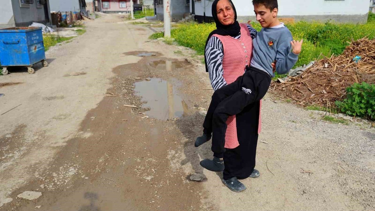 Bu sırada mahalle sakinlerinden Cemile Atay, hem zihinsel hem bedensel engelli evladı Ahmet Atay'ı (17) kucağında getirip, 'Okul servisi buraya girmiyor. Her gün çocuğumu yola kadar kucağımda taşıyorum, hastalıklara kaldım' diyerek feryat etti.