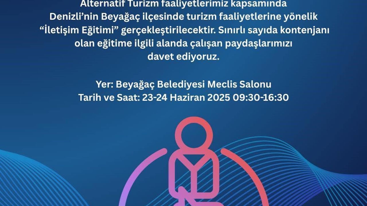 Beyağaç Belediyesi, Güney Ege Kalkınma Ajansı’nın "Yerel Kalkınma Hamlesi" programı ‘Alternatif Turizm’ faaliyetleri kapsamında, ilçe genelindeki turizm sektöründe faaliyet gösteren işletmeler ve çalışan paydaşlar için "İletişim Eğitimi" düzenliyor. Beyağaç Belediyesi Meclis Salonunda gerçekleşecek olan eğitimler, 23-24 Haziran 2025 tarihlerinde 09.30 ila 16.30 saatleri arasında devam edecek.