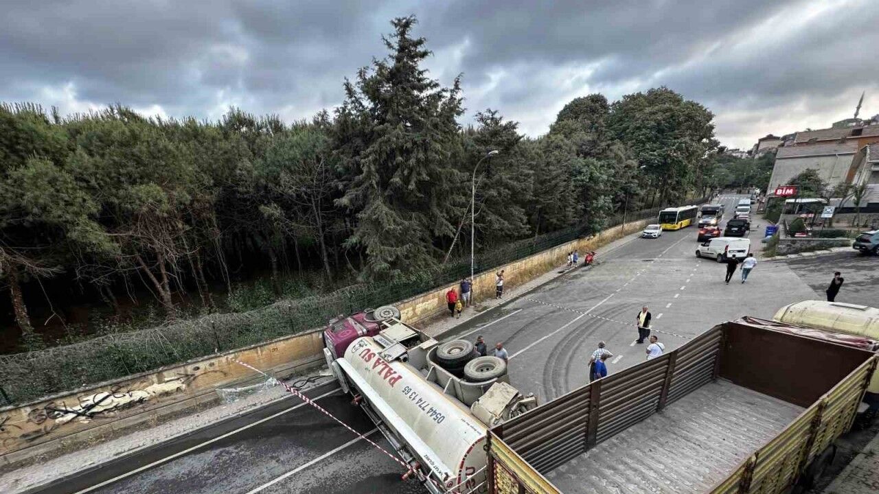 Beykoz’da geri manevra yaptığı esnada kontrolden çıkan su tankeri kayarak park halindeki hafif ticari araca ve hafriyat kamyonunun dorsesine çarparak devrildi. Kazada tankerin sürücüsü yaralandı.