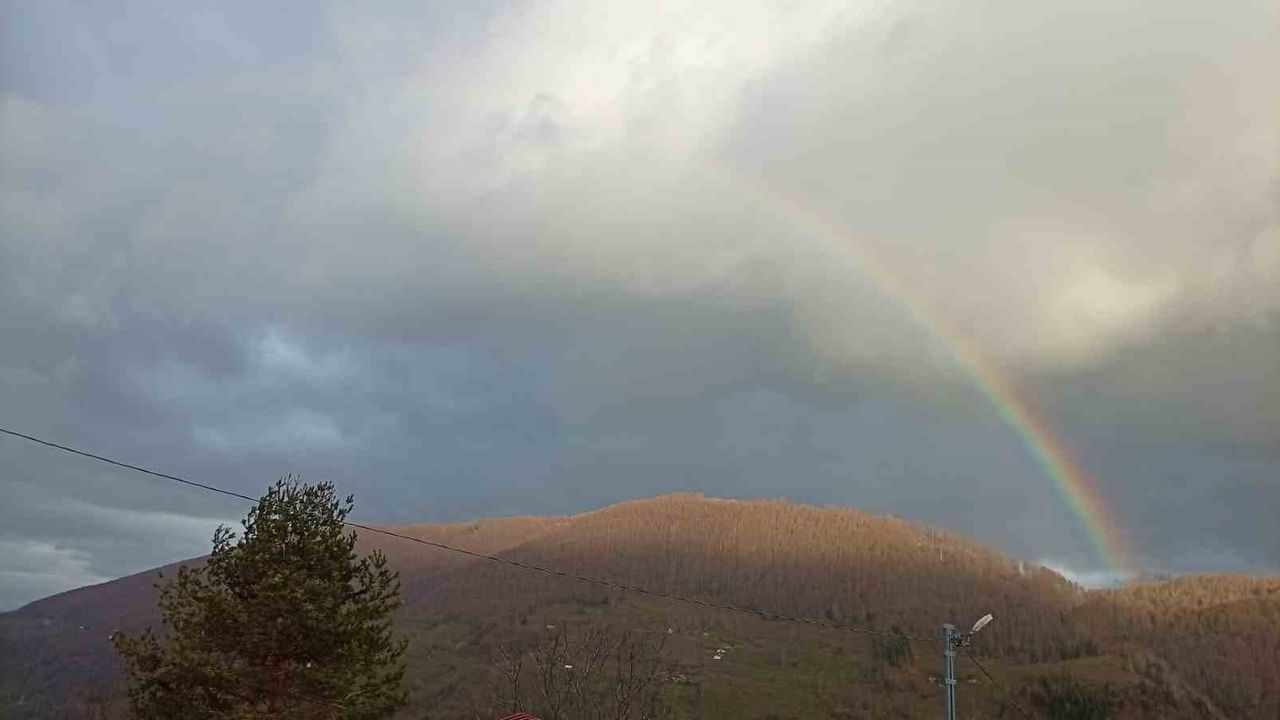 İlçenin bin rakımlı yayla ve tepe kesimlerinde etkili olan sağanağın ardından güneşin yüzünü göstermesiyle gökyüzünde renk cümbüşü yaşandı. Bulutların arasından süzülen güneş ışıkları ve bölgedeki sis tabakasıyla birleşen gökkuşağı, yeşil doğanın üzerinde güzel görüntüler oluşturdu.