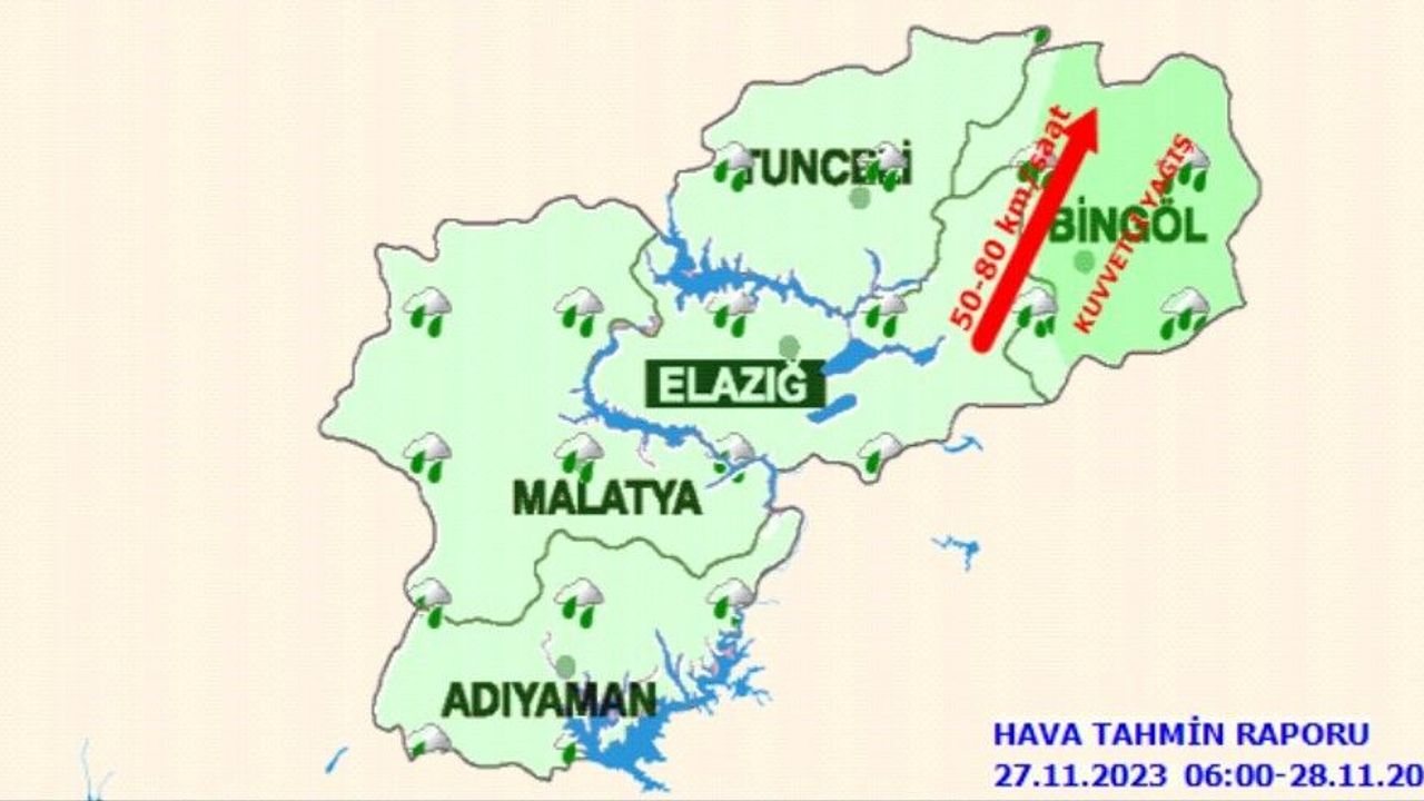 Meteoroloji 13. Bölge Müdürlüğü’nden yapılan açıklamada, “Bölgemiz genelinde havanın parçalı çok bulutlu, öğle saatlerine kadar aralıklı yağmurlu yüksek kesimlerin ise karla karışık yağmur ve kar yağışlı olarak geçmesi beklenmektedir. Yağışların Bingöl çevrelerinde yer yer kuvvetli olması beklenmektedir. Hava sıcaklıklarının mevsim normallerinin 2 ila 4 derece altında seyredeceği tahmin edilmektedir. Yağışların öğle saatlerine kadar Bingöl çevrelerinde yerel kuvvetli (21-50 kg/m2) olması beklendiğinden meydana gelebilecek sel, su baskını, yağış anında kuvvetli rüzgar(kuvvetli rüzgarlar sebebiyle çatı uçması, ağaç ve direk devrilmesi, soba ve baca gazı kaynaklı zehirlenmeler) gibi olumsuzluklara karşı dikkatli ve tedbirli olunmalıdır. Rüzgarın akşam saatlerine kadar Bingöl çevrelerinde güney yönlerden kuvvetli (40-60 km/saat), dağlık ve yüksek kesimlerde kısa süreli fırtına (60-80 km/saat) şeklinde eseceği tahmin edildiğinden soba ve doğalgaz kaynaklı baca gazı zehirlenmesi, çatı uçması, ağaç devrilmesi ve ulaşımda aksamalar gibi olumsuzluklara karşı dikkatli ve tedbirli olunmalıdır” denildi.