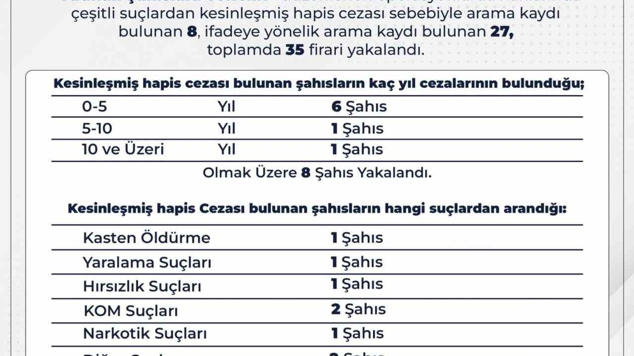 Öte yandan aranan şahıslara yönelik düzenlenen operasyonlarda, çeşitli suçlardan haklarında kesinleşmiş hapis cezası bulunan 8, ifadeye yönelik arama kaydı bulunan 27 kişi olmak üzere toplam 35 firarinin yakalandığı aktarıldı.