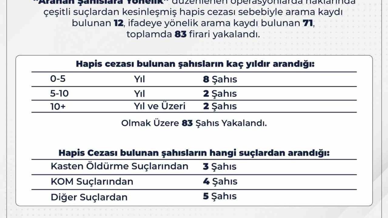 Bingöl’de aranan şahısların yakalanmasına yönelik 5-20 Mayıs arasında uygulamalar gerçekleştirildi. Bu çerçevede haklarında değişik suçlardan kesinleşmiş hapis cezası bulunan 12 ve haklarında ifadeye yönelik arama kaydı bulunan 71 şahıs yakalandı.
